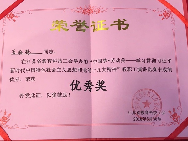 我院石艳艳老师在省教育科技工会举办的“中国梦•劳动美”演讲比赛中获奖