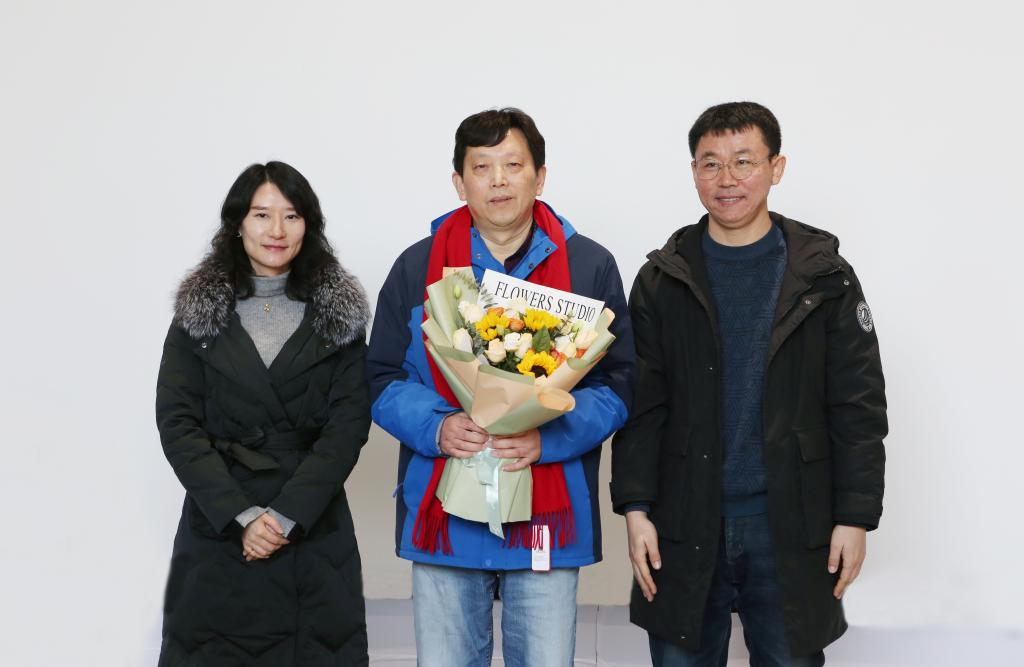 学院党委书记陈丹、副院长(主持工作)刘泱育分别为黄建远教授献上象征祝福与温暖的鲜花及红围巾。