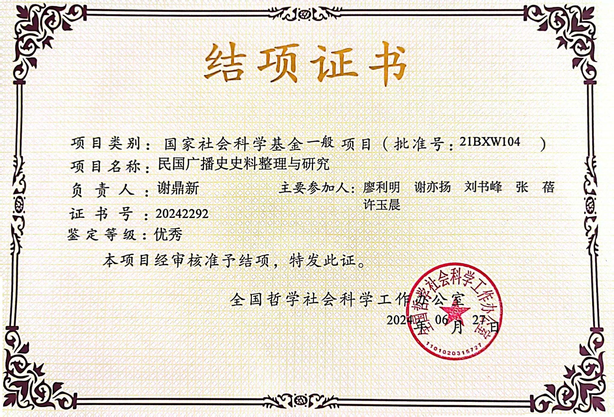 近日:我院谢鼎新教授主持的个人第二项国家社科基金《民国广播史史料整理与研究》结项,喜获“优秀”等级。谢鼎新教授多年来持续在中国广播事业史研究领域辛勤耕耘,也反映我院科研成果质量近年来不断提升。