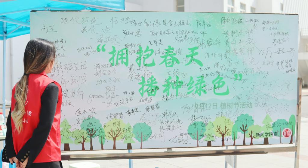 通过线上线下同步宣传,同学们12日纷纷来到现场踊跃参加,将播种绿色付诸实践。活动现场,环保志愿者大力宣传生态文明小知识,让同学们意识到,“要像保护眼睛一样保护生态环境,像对待生命一样对待生态环境”。播种志愿者引导同学们在主题海报上签名留念,分发绿植种子和土壤、花盆,并指导同学们挥动铁铲,浅挖土坑,播种绿色,施肥浇水。同学们纷纷表示,会把盆栽带回宿舍,用心照料。一想到自己亲手种下的种子有一天能够破土而出,焕发生机,营造出一片绿意,同学们感到既充实又欣慰。