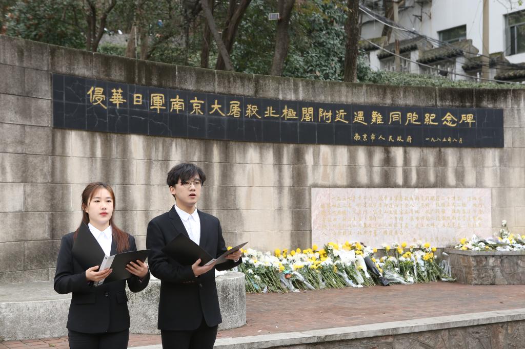侵华日军南京大屠杀北极阁附近遇难同胞纪念碑矗立在苍松翠柏的环抱之中,寒风拂过,更增添了一份悲伤的气氛。同学们在北极阁、中山陵和仙鹤门3处侵华日军南京大屠杀遇难同胞丛葬地前,默哀鞠躬、敬献花圈,寄托对遇难同胞的哀思。“烽火连三月,家书抵万金”,新闻学院的刘子晗、叶静逸和张钰同学分别朗读了三封在战争年代的家书,家书中的一字一句都展示了那段黑暗的时光里星星点点的温情与感动。接着,学生们朗诵了《南京、南京》,用声音寄予哀思,用声音缅怀历史。最后,同学们以一首大合唱《和平之歌》结束了本次国家公祭日纪念活动。