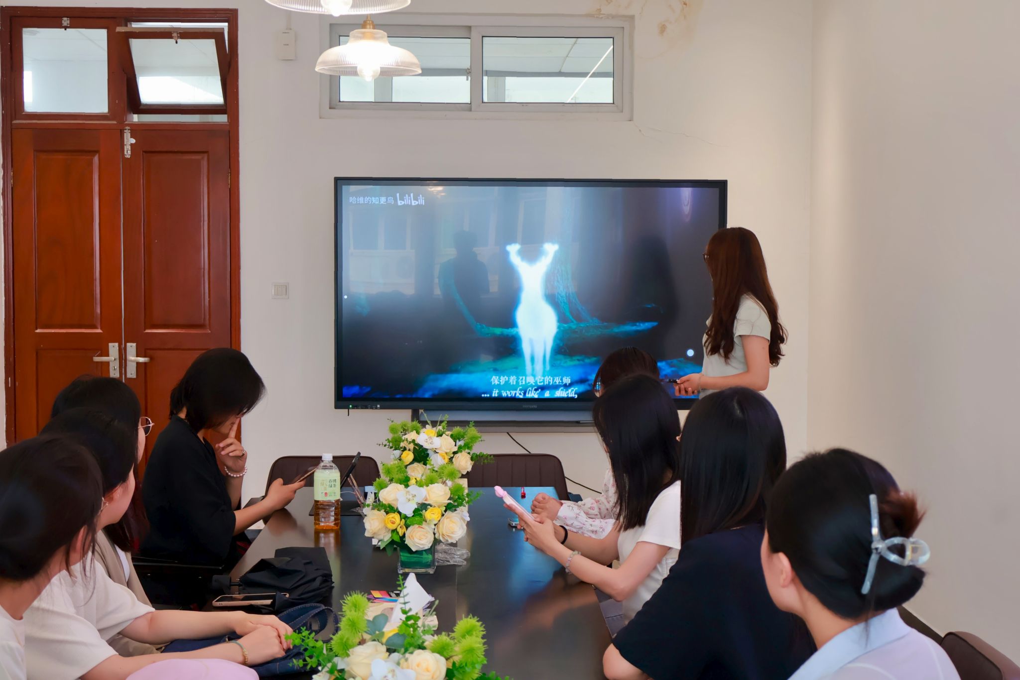 活动以《哈利·波特》系列中摄魂怪出没的片段为切入点,压抑的暗黑音乐营造出了沉浸式场景。随后,主持人黄圣娟同学从心理学角度展开解析:“摄魂怪引发的不适感与抑郁情绪有相通性,就像焦虑会吞噬快乐记忆——但电影也给出了魔法解法。”伴随着主持人的提示音,现场同学们一同闭目尝试正念呼吸法,光影实验室瞬间化身为沉浸疗愈空间。