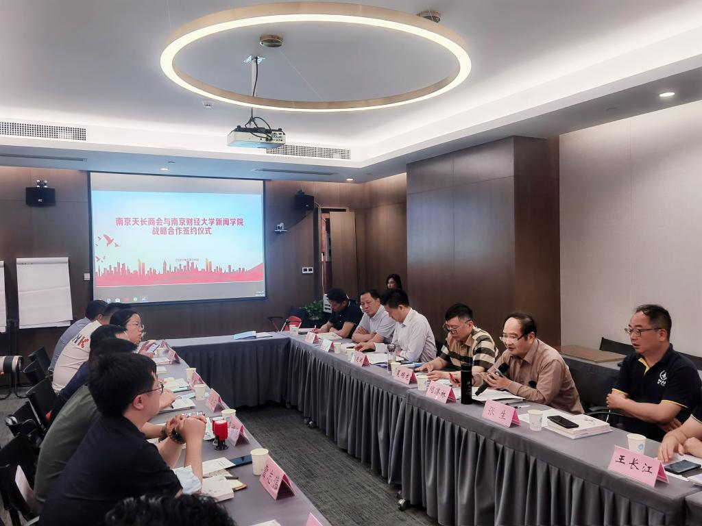 高晓东书记介绍了新闻学院发展情况以及学院党建工作特色,李娜副处长介绍了南京财经大学人才培养和近期访企拓岗专项行动的相关情况,希望能以新闻学院与南京天长商会合作为契机,进一步加强学校与商会企业的交流合作,更好地为企业提供优秀人才,实现高质量就业,实现校企发展的双赢。