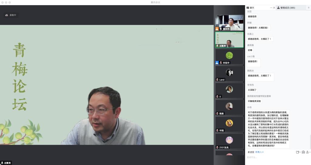 讲座的提问环节气氛异常热烈,胡翼青对屏幕前十多个观众提出的问题进行细致解答,提问人员包括本学科领域的同行,还有新闻学院的研究生、本科生。本场讲座持续两个半小时,讲座过程中互动频繁且热烈,显现出新闻学院浓厚的学术氛围。