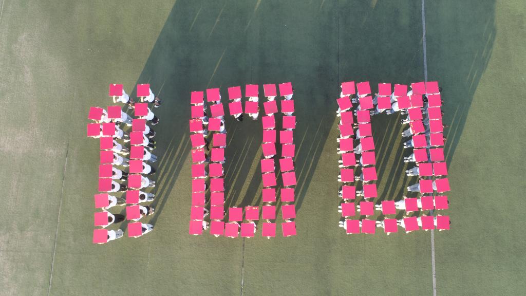 伴随着全场百名新党员“不忘初心跟党走,青春奋进新时代”的青春誓言,118名“00”后新党员迅速变换队形,亮出手中承诺,汇聚成数字“100”,致敬建党百年。