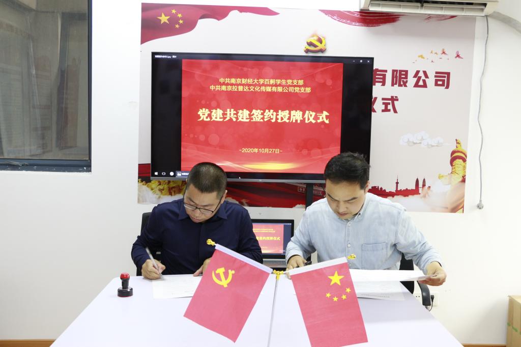 据悉,百舸学生党支部是全省高校系统中首批创新型学生党支部,由校团委与新闻学院共同打造,百舸学生党支部归口新闻学院党总支,在具体业务工作上接受校团委和新闻学院的联合指导。党支部真正建在学校团属学生组织(社团)上,创新了党建带团建、团建促党建、党团建与业务工作深度融合发展的新模式、新路径、新举措,也体现了“党有号召,团有行动”的优良传统。百舸学生党支部成立以来,在校党委的亲切关怀下,党支部成立以来,以加强思想政治引领为核心任务,以主题党日、志愿服务、社会实践等形式为着力点,着重培养学生党员良好的政治素质与过硬的组织宣传能力,同时充分发挥党员先锋模范作用,认真做好在全校团属学生组织(社团)中的政治表率和思想引领,以扎实的工作入选2020年度江苏省共青团工作“10100”创新创优项目。南京拉普达文化传媒有限公司党支部是全省互联网公司首批党支部之一,双方借此合作,将充分发挥本支部特色优势,深化合作,有效整合资源,达到“1+1>2”的共建合作效果。