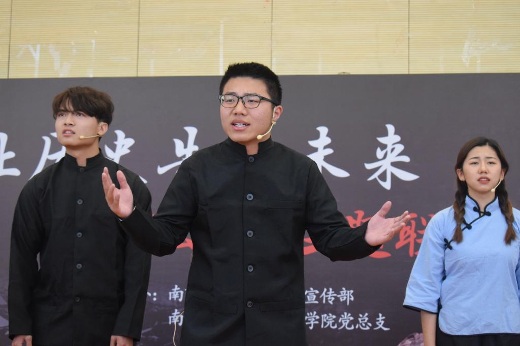 “由于常常受到惊吓,许多年后,凡听到沉重的皮靴声,奶奶仍会吓得发抖,可见所受精神创伤是何等的严重。”新闻学院郭春萍老师首先朗读了南京大屠杀幸存者李道煃老先生致女儿李南的一封家书为大家打开了尘封的历史。接着,八位同学倾情演绎的群诵《狂雪》,描绘出南京大屠杀中残酷血腥的场面,屈辱与痛苦涌上每一位观众的心头。李博伟老师结合参观拉贝故居的经历,与大家分享了《拉贝日记》的片段,通过一个外籍人士的视角,控诉了南京大屠杀中日本军队的种种罪行。