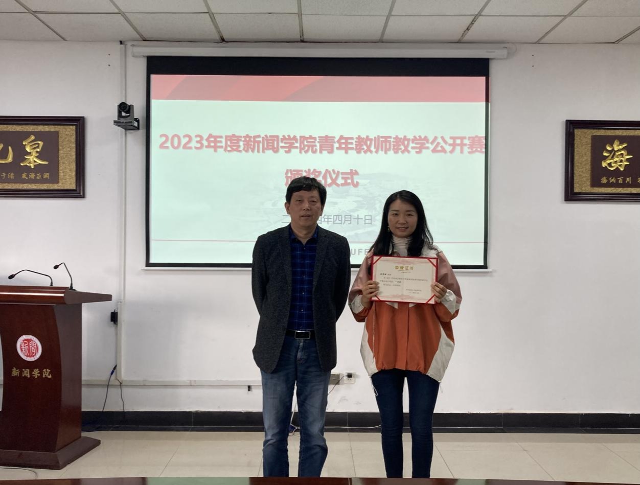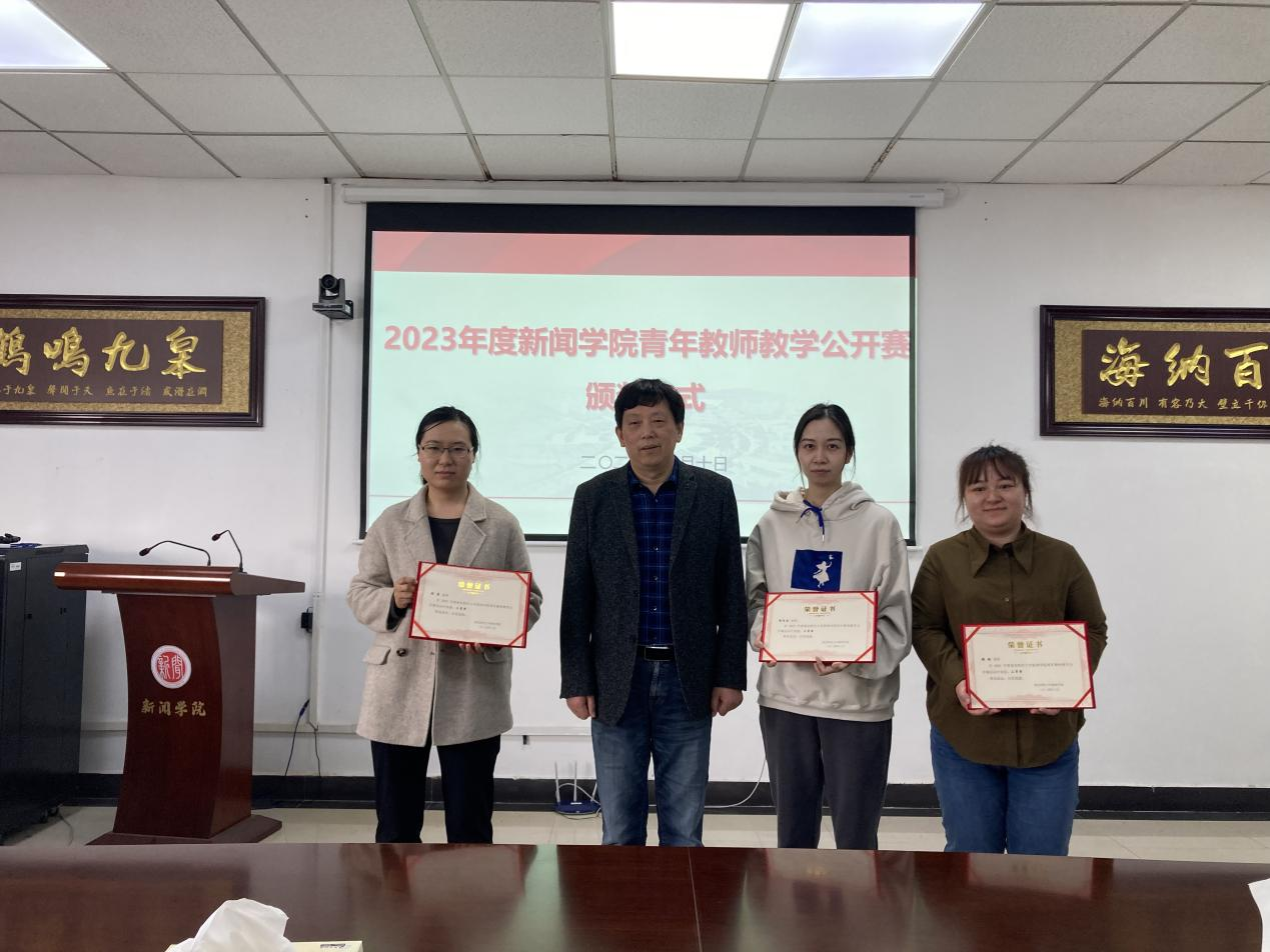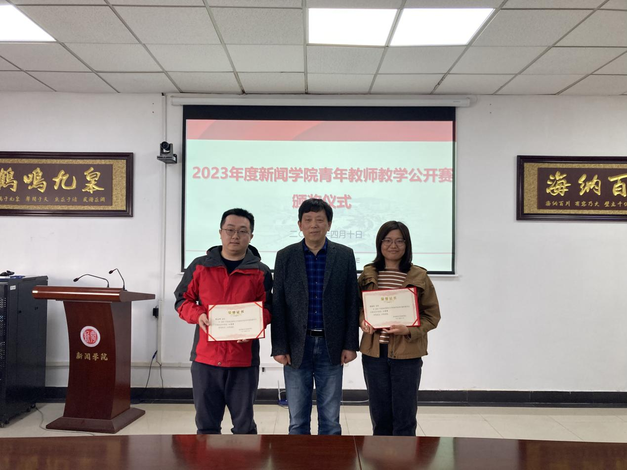 为深入学习贯彻习近平新时代中国特色社会主义思想,落实全国教育大会精神及中共中央、国务院《关于全面深化新时代教师队伍建设改革的意见》要求,进一步激励、引导广大教师重视和投身本科教学,提升本科教学质量,根据《南京财经大学教师教学公开赛竞赛管理办法》(南财大教字〔2016〕1651 号)精神和《2023年度新闻学院青年教师教学公开赛实施方案》,新闻学院组织实施了2023年度青年教师教学公开赛活动,共评出一等奖1名,二等奖2名,三等奖4名。4月10日下午,在德正楼507会议室举行了2023年度新闻学院青年教师教学公开赛颁奖仪式,全体教职工参加仪式活动,仪式由李博伟副书记主持,刘霞云副院长宣读了表彰文件,校督导黄建远教授为获奖老师颁发证书。