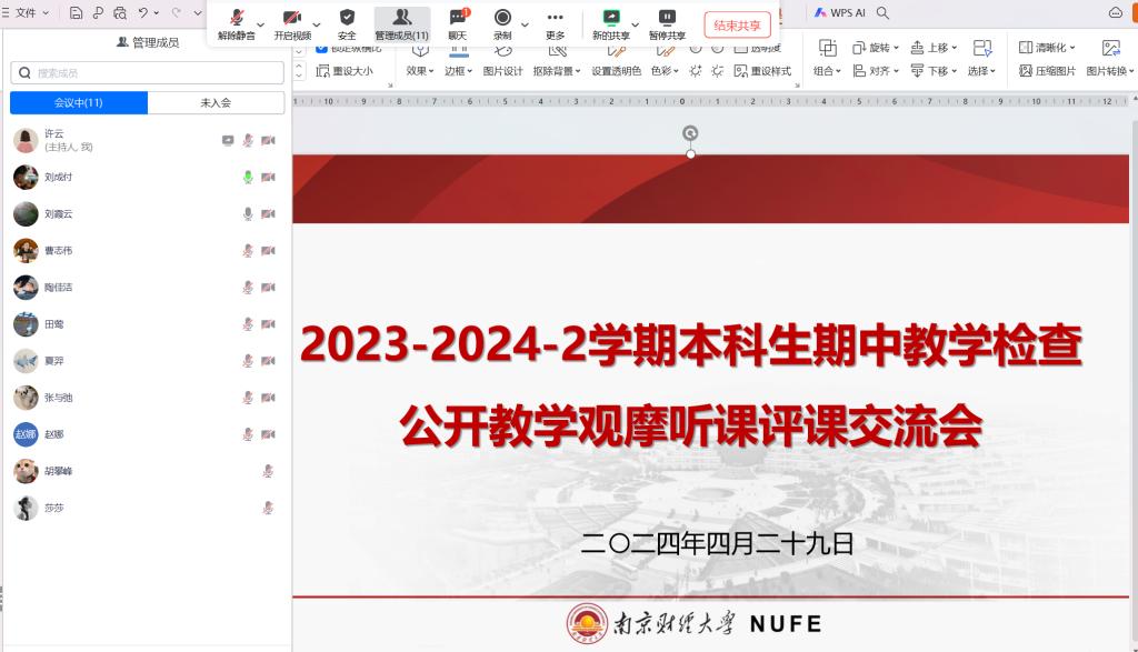 为进一步提高课堂教学质量,结合本学期本科生期中教学检查工作部署安排,新闻学院于4月29下午在德业楼118教室组织观摩了陈莎莎老师主讲的《应用写作》课程,同时于4月29日晚上7:30组织召开了线上的公开教学观摩听课评课交流活动。教学副院长刘霞云、院本科教育教学督导刘成付和赵娜、系主任曹志伟和夏羿、各系专任教师代表陶佳洁、胡攀峰、张与弛、田莺等参会。会议由教学副院长刘霞云主持。