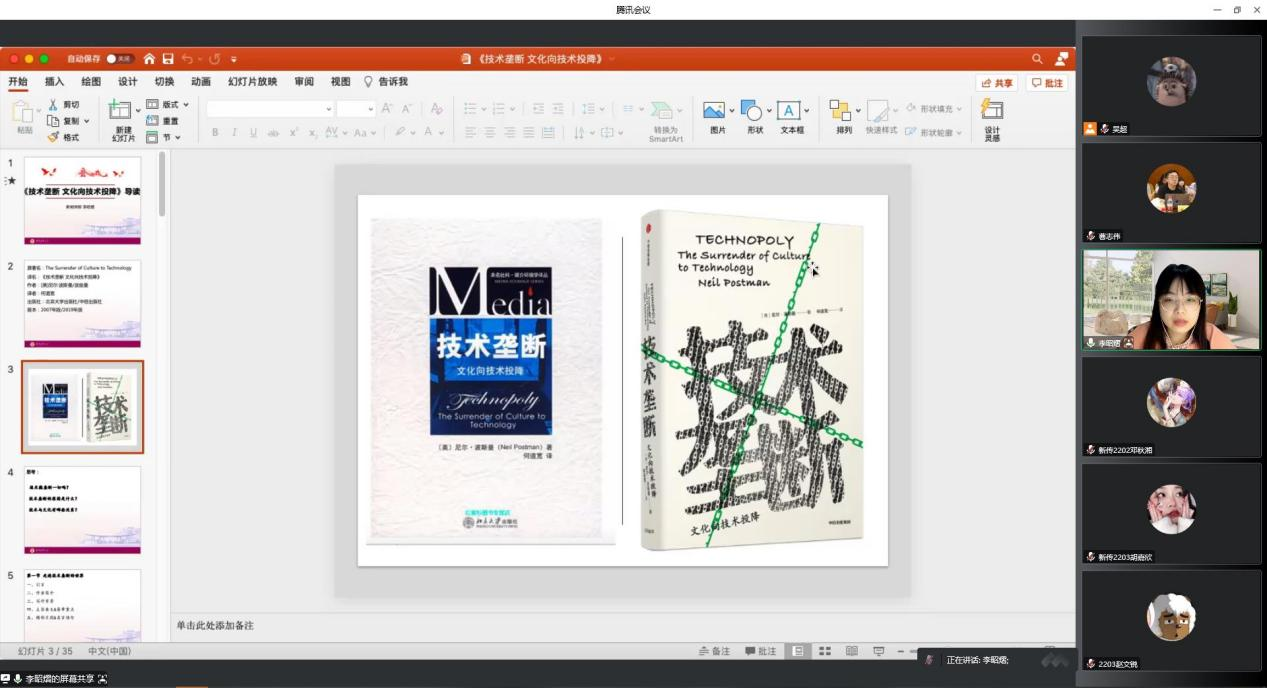 在此次读书会开始之前,李老师向大家解释选择本次主题的缘由——想向大家介绍一些有难度、能提升研究生素质的经典书目。并且李老师想通过本次读书会,让各位研究生对于技术问题进行深入思考,这样对22级研究生论文写作也能有一定的思维启发。李老师以《技术垄断:文化向技术投降》作为切入,并结合尼尔·波斯曼的其余两篇著作《童年的消失》、《娱乐至死》,中间穿插多个自身思考的案例并以平实的语言呈现,为同学们系统、生动的讲述技术对人们的影响。