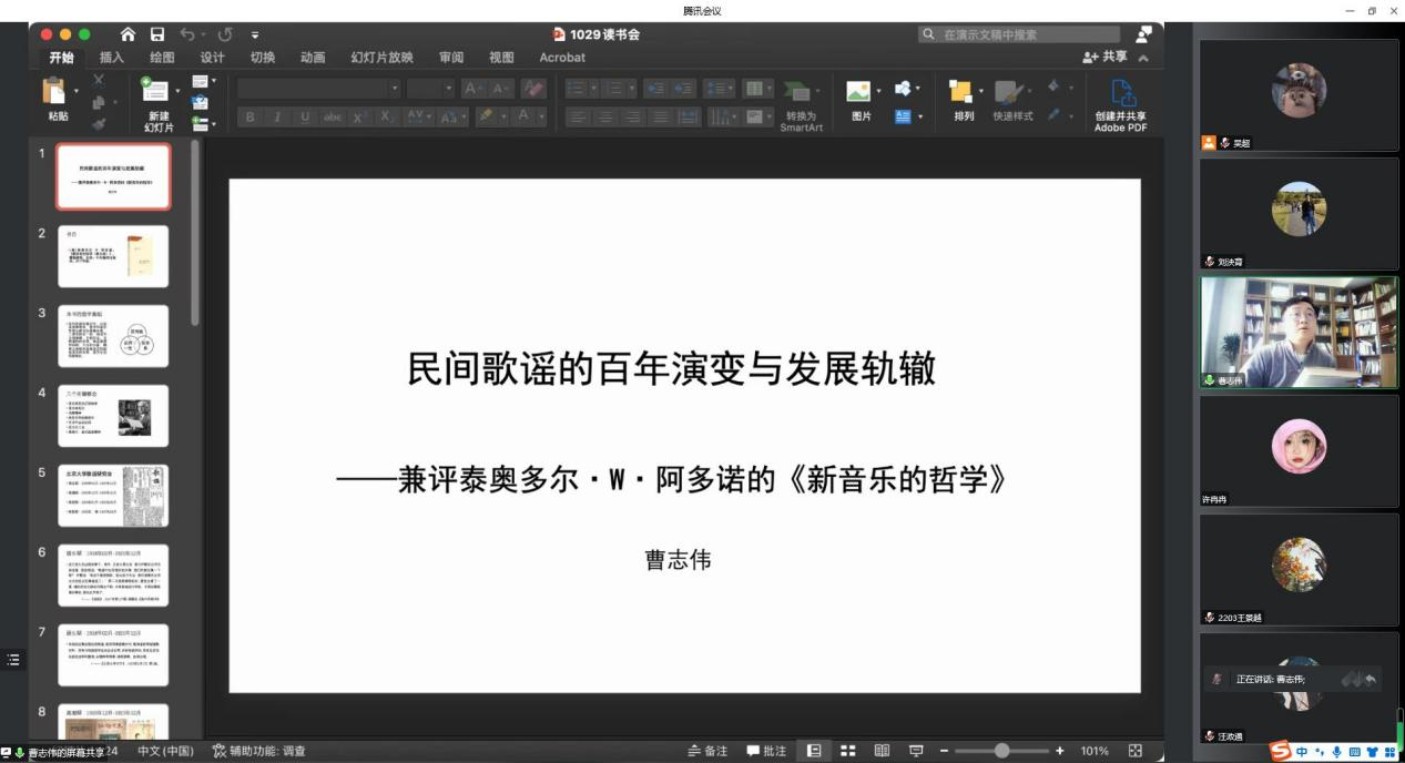 10月29日下午,南京财经大学新闻学院第二十五期“研情偶寄”读书会在线上成功举办。本次读书会的主题是“民间歌谣的百年演变与发展轨辙——兼评奥多尔·W·阿多诺的《新音乐的哲学》”,主讲人为我院的曹志伟老师。本场读书会由我院刘泱育副院长主持,与会人员有夏羿、段永杰等青年教师,还有我院研究生和部分本科生。
