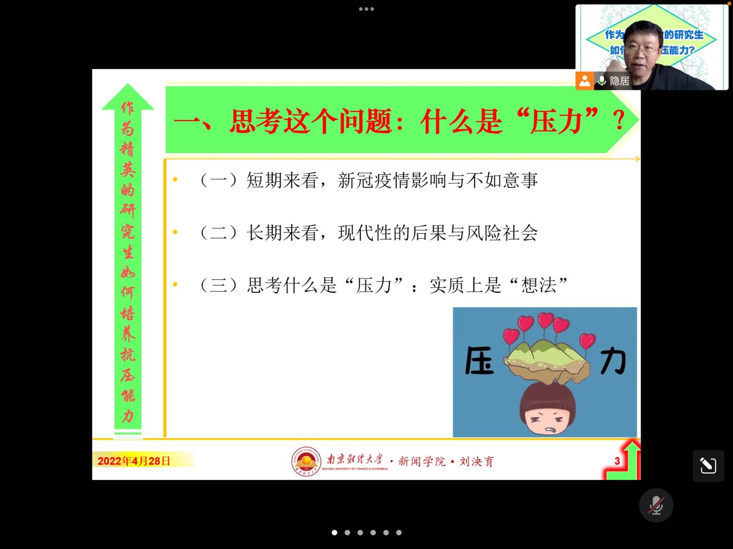 2022年4月28日下午14点,为了帮助研究生同学们排解压力,新闻学院在线上举办了题为“作为精英人才的研究生如何培养抗压能力?”的讲座,主讲人为新闻学院副院长刘泱育。本次讲座由毛颖老师主持,新闻学院全体研究生都参加了此次讲座。